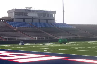 The installation of the new FieldTurf is one of numerous athletics facility upgrades to take place all around the Liberty University campus this summer. Last week, flag poles were installed atop the East stands at Williams Stadium and on the lawn in front of the Hancock Athletic Center.
