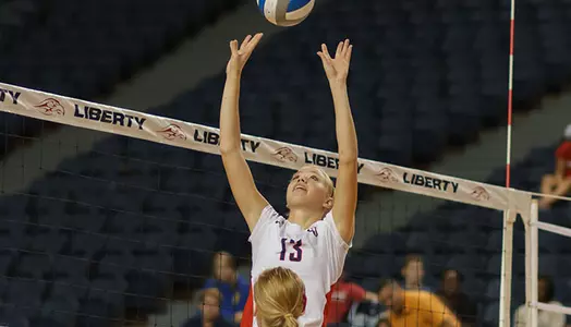 Liberty posted three blocks during the second set, slowing down the Dukes' offense to the tune of a .167 attack percentage. The Dukes surged late, drawing to within three points at 23-20. Douglas then notched a kill for set point, and a Monica Johnson kill sealed set two, 25-21.