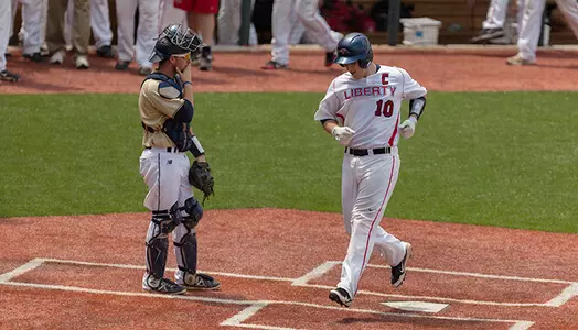 After the Buccaneers left runners at second and third in the top of the eighth, Liberty took the lead in the bottom of the frame. First baseman Alex Close started off the inning with a double into the right-center field gap and advanced to third base on a deep fly ball to center field by shortstop Jake Kimble. Two batters later, Perritt plated Close with a two-out bunt base hit, putting the Flames in front, 2-1.