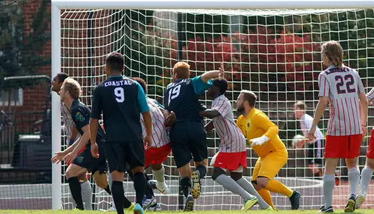 Coastal Carolina netted the contest's first goal during the 24th minute. Off a corner kick, Elis Bjornsson scored his fourth goal of the season for a 1-0 Chanticleer advantage. Defender Tommy Gudmundsson lifted the corner kick from the right sideline to the far post, where Ellis headed the ball down and in.