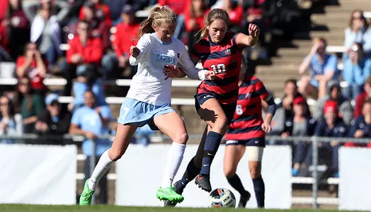 A diving save by Van Noord kept the contest scoreless in the 31st minute. UNC forward Bridgette Andrzejewski slipped a shot behind the Liberty goalkeeper, but she was able to dive back and smother the shot to prevent the score.