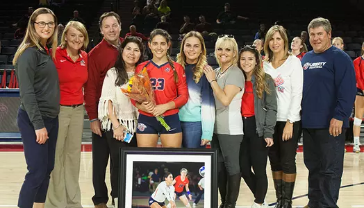 The Blue Hose led set three, 15-13, following a kill by Tripp. Liberty bounced back, and took the lead for good at 20-16 when Vess sparked a 4-0 Lady Flames rally by scoring a kill. Vess later scored the match-clinching kill, closing out a 25-19 victory.