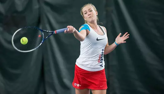 The Mean Green won back-to-back matches in the No. 1 and No. 2 singles positions to claim the 2-1 lead against Liberty. Maria Kononova defeated Khval in straight sets, 6-2, 6-1 to put North Texas on the board. Shortly following, Tamuna Kutubidze bested Belen Rivera in straight sets, 6-0, 6-4 to take a 2-1 advantage over the Lady Flames.