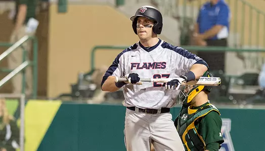 Flames reliever Jordan Scott drops to 0-1. The final pitcher of four Liberty pitchers in the contest, Scott allowed one on one hit over 1/3 of an inning.