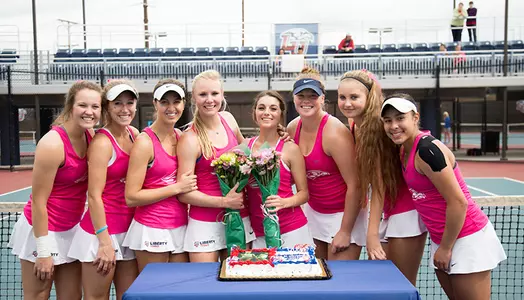 Hassey won in straight sets over Nuttall (6-1, 6-2) to put the hosts ahead, 2-0. The senior's win was the 65th singles victory of her four-year Liberty career, which moved her into third place in program history for singles wins.