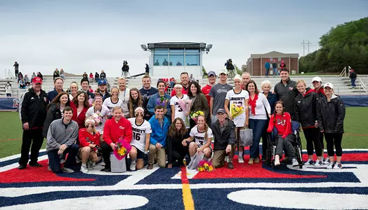 Prior to the contest, the team honored its seven seniors (Ashlyn Altieri, Eden Bayuk, Paige Britton, Courtney Brown, Casey Thate, Victoria Tickle and Melanie Via), and several of them played crucial roles in the win.