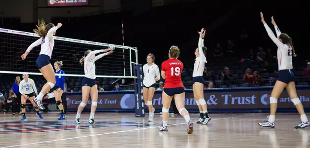 Liberty's Anna Gragg hit .400, scoring 18 kills and adding three blocks. Gabrielle Vess followed with 11 kills, while Margaret Latchford collected 20 digs. Anna Willey dished out a match-high 32 assists, while Sirena Vorster (.615) and Lydia Smith (.389) both scored eight kills. Jenna Culhan served up a career-high three aces, and Victoria Baptista collected 11 digs.