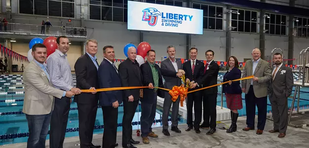 Friday's event started with a Grand Opening ceremony. Following an introduction from Liberty Associate Athletics Director for Development/Executive Director of the Flames Club Bob Good, Liberty President Jerry Falwell, Lynchburg Regional Business Alliance CEO Meghan Lucas, Liberty Women's Swimming & Diving Head Coach Jake Shellenberger and Liberty Director of Athletics Ian McCaw all gave their remarks. After a dedicatory prayer by Dr. Ed Gomes came a ribbon cutting ceremony.