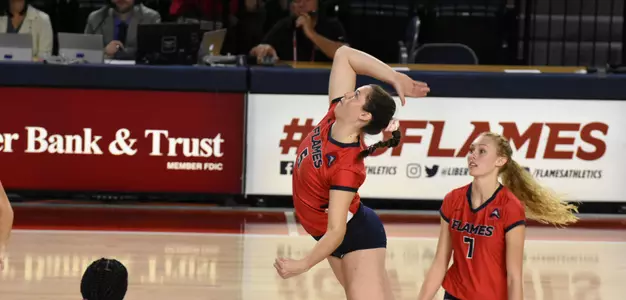• The hosts appeared to be in control of set two, leading 20-16 after a Kuper kill. The Lady Flames battled back with a 7-2 run, as Morris' solo block made it 23-22 Liberty. After a Lipscomb sideout, Kruse scored the final two points with a kill and an ace, clinching the 25-23 win.