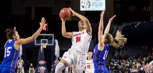 The Blue Hose, who rank No. 14 nationally for three-pointers made, stayed close throughout by hitting eight triples. However, Liberty's post dominance proved too much for the visitors to overcome, as Barbour fashioned a double-double (20 points, 10 rebounds) and the Lady Flames dominated the points in the paint category, 44-14.