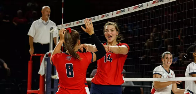 • Liberty led the opening set from start to finish, starting out on an 8-1 run on the way to a 25-16 victory. The Lady Flames hit .320 in set one, compared to .000 for the Golden Grizzlies.