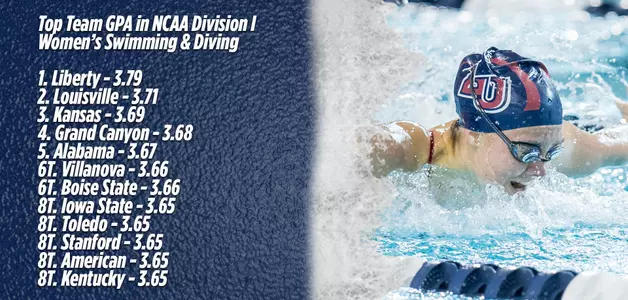 The Liberty swimming & diving team had a tremendous fall semester in the classroom, obtaining a 3.79 team GPA, which led all collegiate swimming & diving programs, men's or women's. Liberty topped the College Swimming Coaches Association of America (CSCAA) Scholar All-America Team list for the fall 2018 semester.
