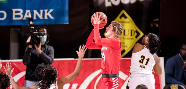 With 5:36 showing on the clock, Kestner knocked down a three-pointer from the top of the key, boosting Liberty's lead from 45-41 to 48-41. She was also fouled in the act of shooting. Although Kestner missed on her attempt at a four-point play, Lytle grabbed the offensive board and quickly found Rettstatt for a layup. All in all, the Lady Flames tallied five points in four seconds to more than double their lead.