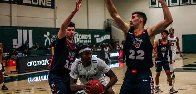 Liberty's defense got off to a good start not allowing the Dolphins to score until the 15:53 mark. As the Dolphins started 0-5 from the field, the Flames jumped out to a 6-0 lead led By Kyle Rode scoring the first four points of the ball game. Both teams struggled on offense as the two each started the game 3-12 from the floor to start the game. Jacksonville (30 percent) outshot Liberty (27 percent) from the floor in the opening period but the two went into halftime tied at 22-22. Darius McGhee led the Flames with eight points in the first half while Tyreese Davis and Dontarius James each scored eight points for the Dolphins.