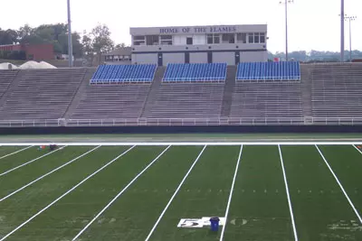 The fifth day of the FieldTurf installation at Williams Stadium was another exciting step towards completion. The sidelines and out of bounds are nearly finished with edging being the only remaining step left. Hash marks and yard line markers where stenciled and cut in preparation for the stitching of white FieldTurf in its place.