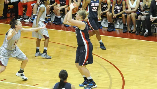 Liberty drops to 0-4 despite a +28 rebounding margin, Ashley Rininger's third double-double in a row (15 points, 14 rebounds) and career scoring highs by Katelyn Adams (16 points) and Tesh Hanson (8 points).