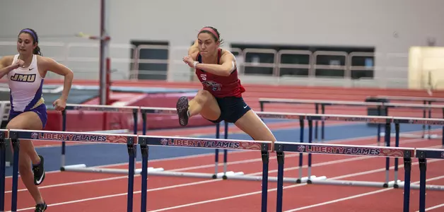 Redshirt senior Jessie Glynn came in third and freshman Rachel Milnes took fourth with matching 12-5.5 clearances in the women's pole vault. Both vaulters punched their tickets to Boston for the ECAC meet, with Glynn equaling her indoor personal best and Milnes, breaking Audrey Rabe's Liberty freshman record of 11-11.75 from the 2014 Liberty Kickoff.