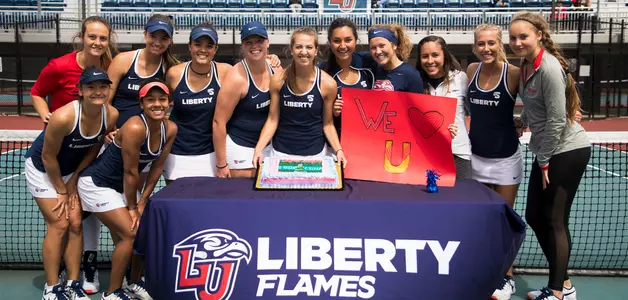 Prior to the match, the Lady Flames women's tennis program took time to honor their lone senior, captain Evangeline Crist. Crist delivered her program-record-tying 87th singles victory of her career in the match, and Liberty won the doubles point and five of six singles bouts en route to the triumph.