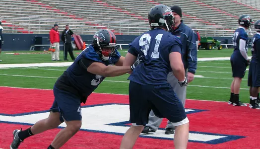 The session was Liberty's second in "shells", as the team practiced without full pads as part of its acclimation period, just like the squad does during its August training camp. The Flames will close out their first week of a three-plus week practice slate tomorrow morning at 10:30 a.m., when Liberty's 90-plus man roster will don full pads for the first time.