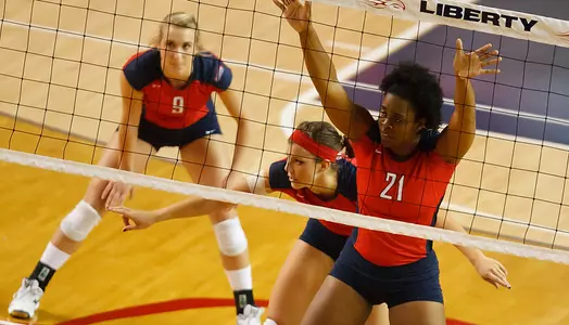 Set one stayed close, at 5-4, until an 8-0 rally by Liberty opened up a 13-4 lead for the home team. Lillie Happel served seven of those points, including three service aces, picking up where she left off against Rider. The Red Flash battled back with a pair of 3-0 rallies, and trailed 16-13 after a combined block by Amanda Zahumensky and Elizabeth Williams and a kill from Williams. Liberty built its lead to eight at 24-16, earning several set point chances before finishing off set one with a 25-19 victory.