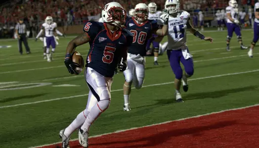 Liberty used big plays throughout the game to secure its third victory at home this year and extend its home winning streak to seven games. Six of Liberty's 10 touchdowns came via plays of 10 or more yards (21 and 55 yard passing plays; 23 and 26 yard rushing plays; 30 yard blocked punt return; 31 yard interception return).